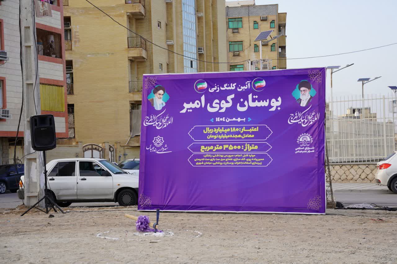آیین کلنگ‌زنی بوستان کوی امیر با مساحت ۳۵۰۰ مترمربع و اعتباری بالغ بر ۱۸ میلیاردتومان با حضور مهدی نوبانی شهردار بندرعباس، رئیس شورا حجت‌الاسلام حیدری و تنی چند از اعضای شورای اسلامی شهر سالاری،نظری، و دبیری‌نژاد همچنین پرویز مدیر منطقه دو شهری و‌ اصحاب رسانه و مردم با محبت برگزار شد.