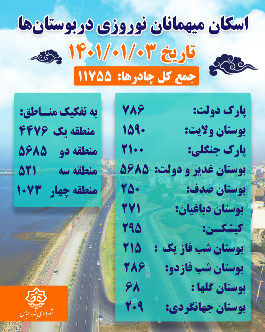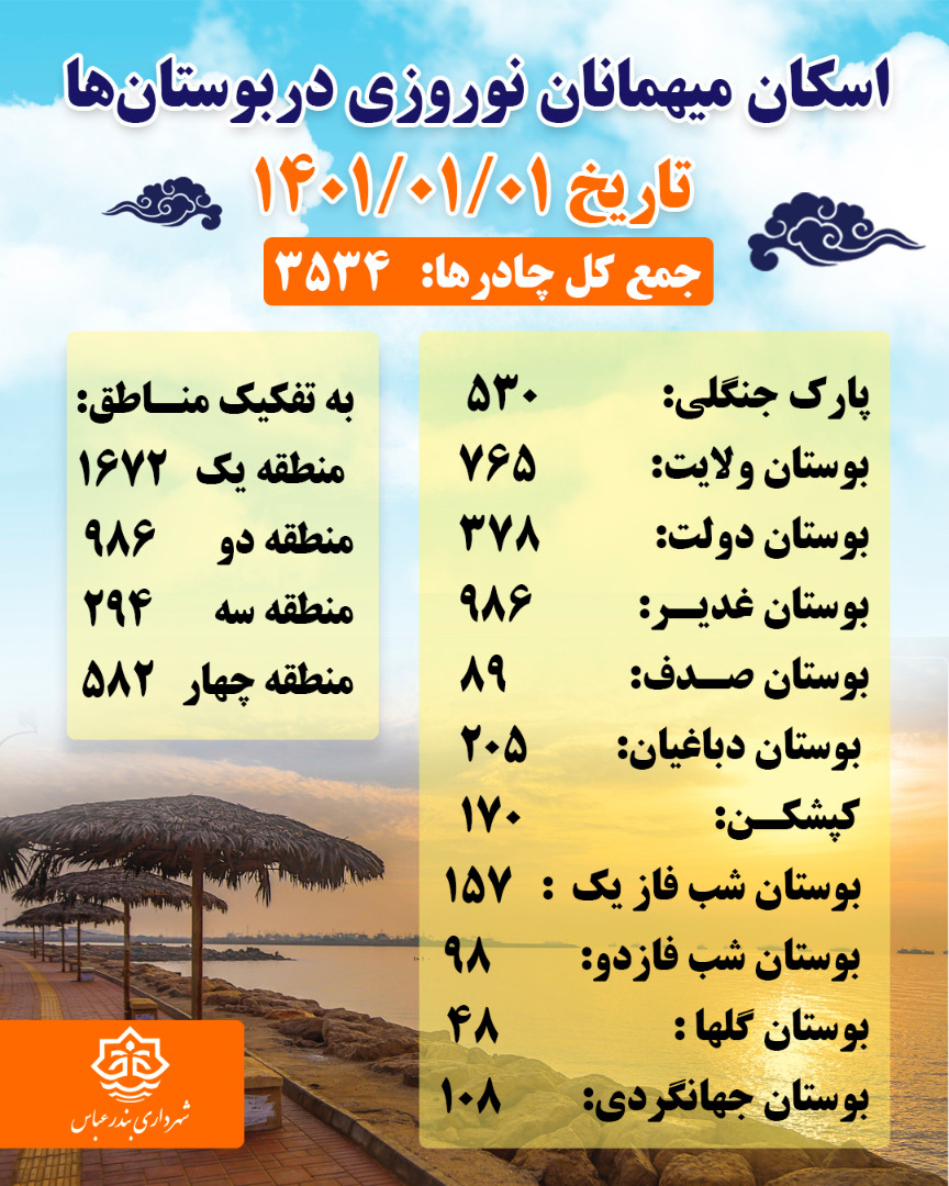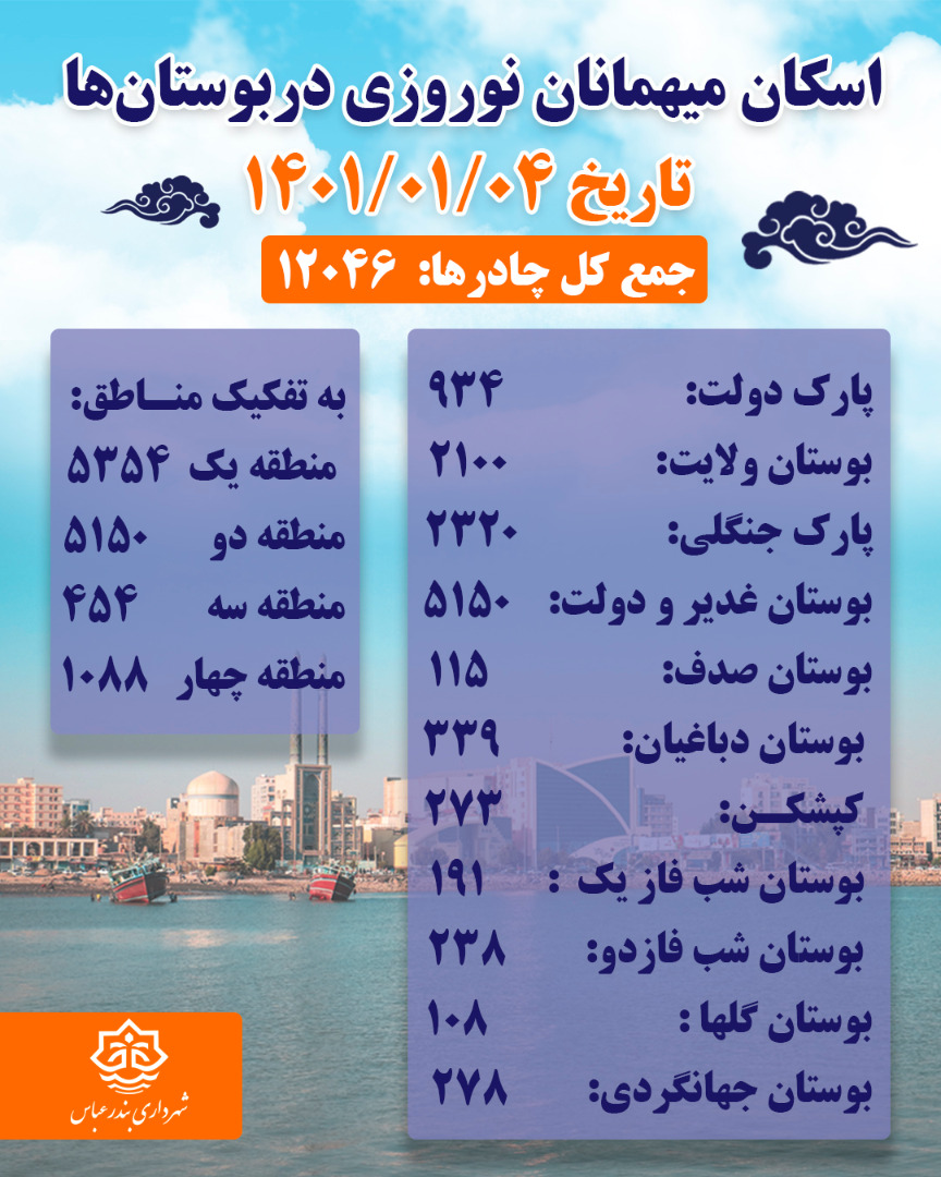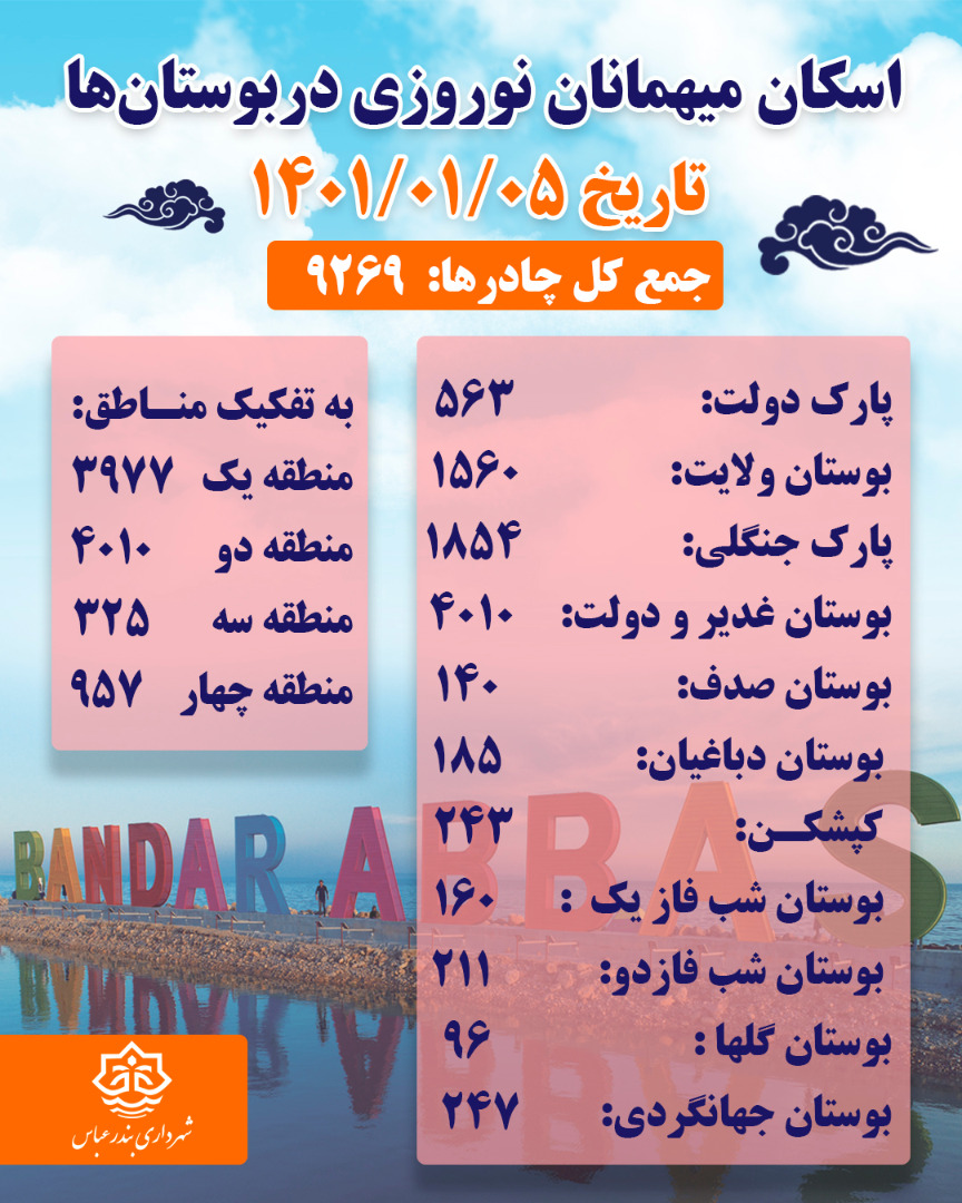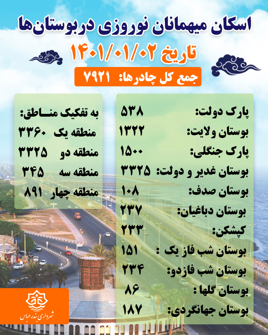 آمار اسكان و نصب چادر در بوستانها و پاركهای شهر بندرعباس از تاريخ اول تا پنجم فروردين ماه١٤٠١