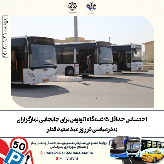 رئیس سازمان حمل و نقل شهرداری بندرعباس، بیان کرد: در پایان مراسم نماز باشکوه عید سعید فطر نیز این اتوبوس‌ها در معابر اطراف مسجد جامع مستقر و آماده ارائه خدمات برای بازگشت به مبادی اولیه نمازگزاران خواهند بود.