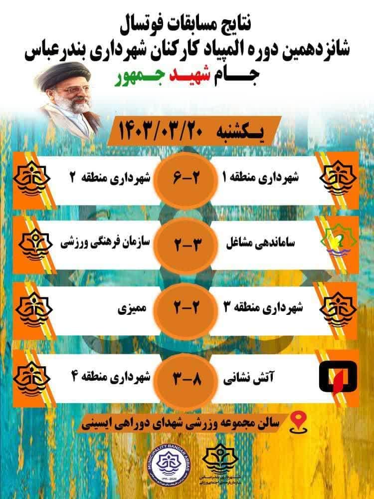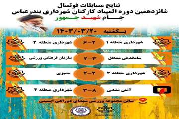 به گزارش مدیریت ارتباطات و امور بین الملل شهرداری بندرعباس و به نقل از روابط عمومی سازمان فرهنگی، اجتماعی ورزشی ؛ مسابقات فوتسال شانزدهمین دوره المپیاد ورزشی کارکنان شهرداری بندرعباس جام شهید جمهور در ۲۰ خرداد ماه با حضور محمدرضا لطفی پور و همچنین ۸ تیم در سالن مجموعه ورزشی شهدای دوراهی ایسینی برگزار گردید.