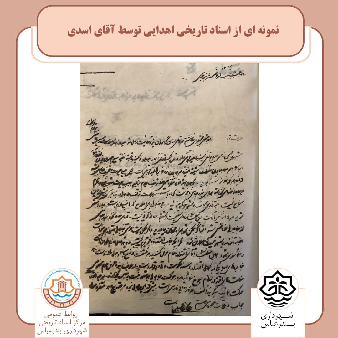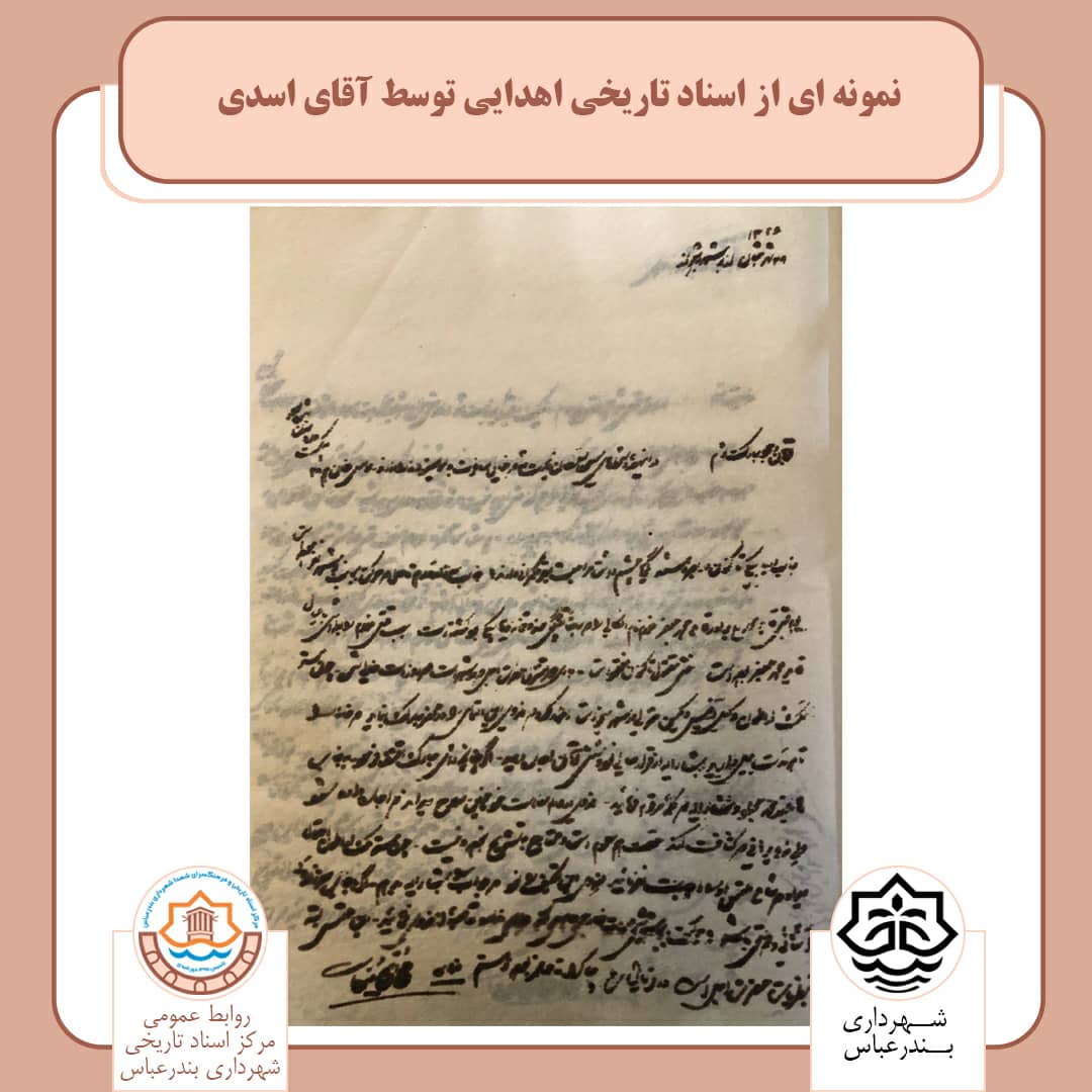 به گزارش مديريت ارتباطات و أمور بين الملل شهرداري بندرعباس اسدی ضمن بازدید از مرکز اسناد تاریخی ، تعداد ۵۵۰ برگ سند تاریخی مربوط به تجار قدیمی از دوره قاجار تا پهلوی اول به این مرکز اهدا نمود. مهمترین هدف ایشان از جمع آوری اسناد تاریخی و اهدا آن به مراکز مربوطه، حفظ اسناد، بازیابی تاریخ وگذشته و کمک به پژوهشگران در حوزه تاریخ است.