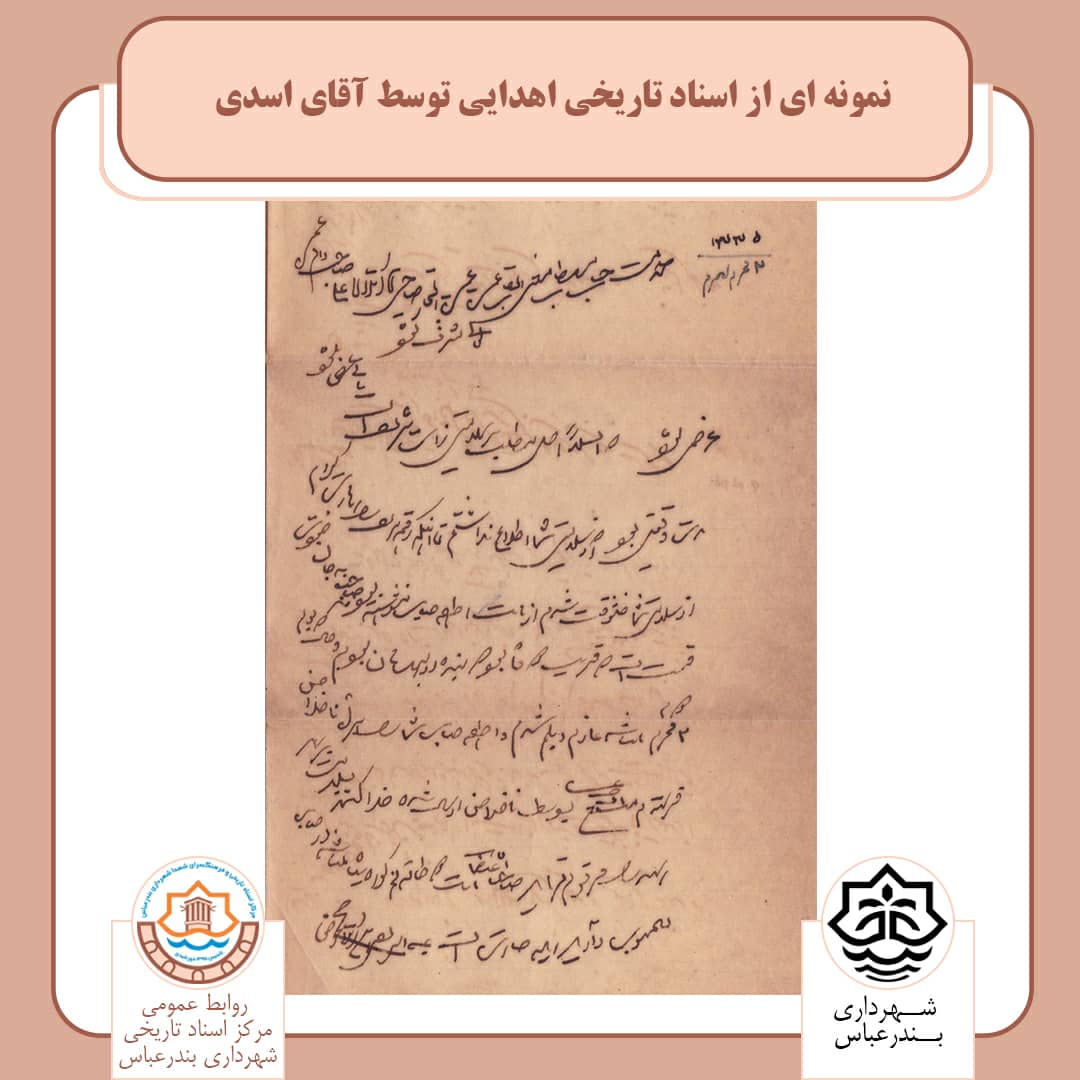 اهدا ۵۰ برگ سند تاریخی مربوط به آقای دهدشتی(تاجر) به مرکز اسنادتاریخی شهرداری بندرعباس