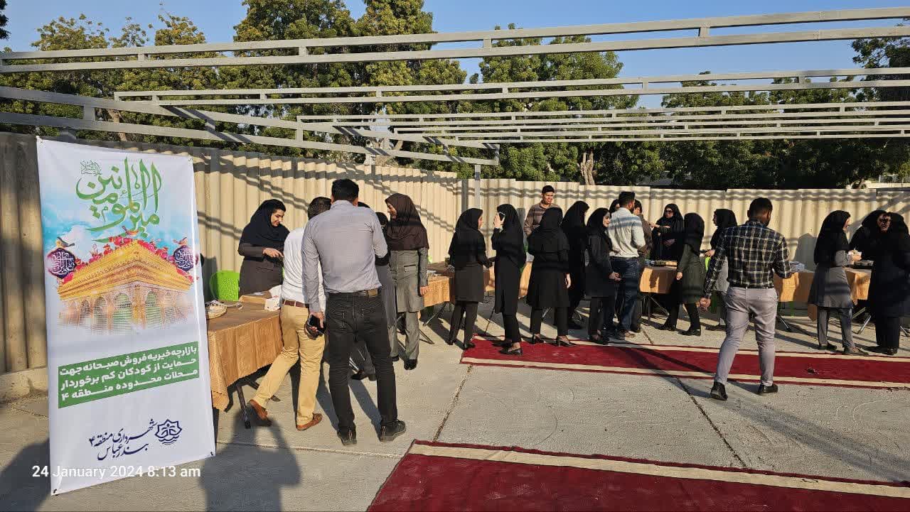 به گزارش مدیریت ارتباطات و امور بین الملل شهرداری بندرعباس به نقل از روابط عمومی منطقه 4، ابراهیم جوزری مدیر روابط عمومی منطقه چهار گفت: همزمان با فرا رسیدن میلاد با سعادت حضرت علی علیه السلام  با مشارکت کارکنان این منطقه، بازارچه خیریه فروش مواد غذایی در محل شهرداری منطقه چهار برگزار شد.