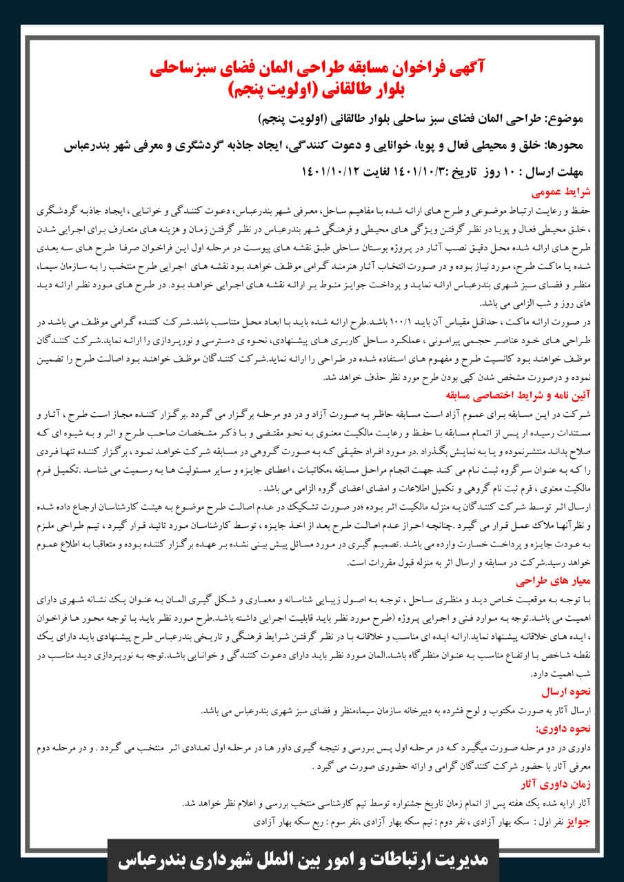 آرمان گفت: حفظ و رعایت ارتباط موضوعی و طرح های ارائه شده با مفاهیم ساحل، معرفی شهر بندرعباس، ایجاد جاذبه گردشگری و در نظر گرفتن ویژگی های محیطی و فرهنگی شهر بندرعباس و زمان و هزینه ی متعارف برای اجرایی شدن طرح های ارائه شده بخشی از شرایط عمومی این فراخوان است.