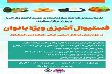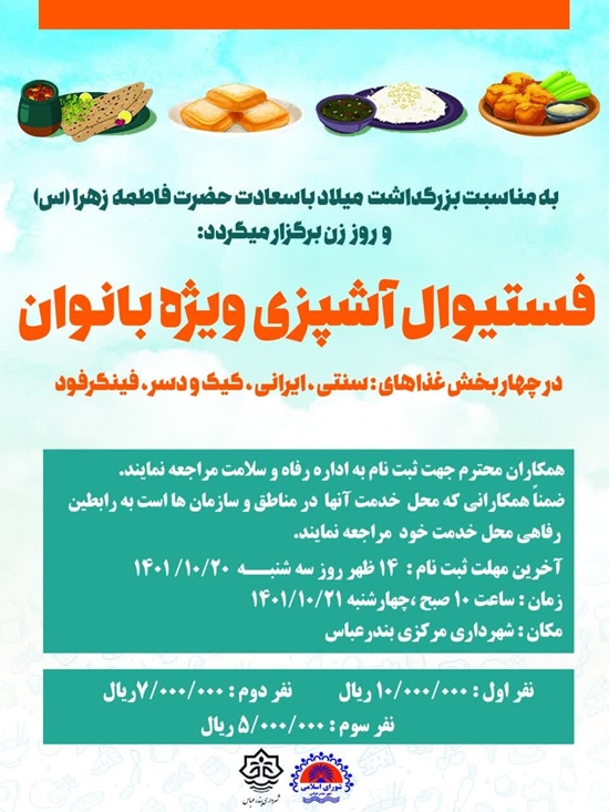 گفتنی است؛ فستیوال آشپزی در چهار بخش غذاهای سنتی، ایرانی، کیک و دسر و فینگر فود در شهرداری مرکزی بندرعباس برگزار می شود و به نفرات برگزیده جوایزی اهداء می شود.