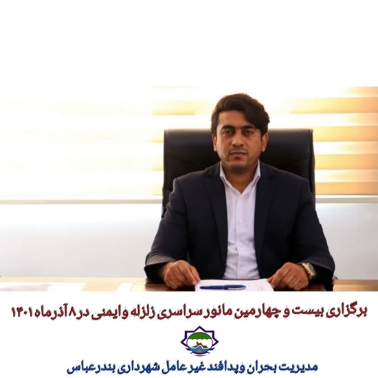 سرپرست بحران و پدافند غیر عامل شهرداری بندرعباس از برگزاری بیست وچهارمین مانور سراسری زلزله و ایمنی در صبح روز سه شنبه هشتم آذر ماه ۱۴۰۱ همزمان در سراسر کشور با شعار " مدرسه ایمن ، جامعه تاب آور " در دبیرستان دخترانه پالایشگاه صنعت نفت بندرعباس خبر داد .