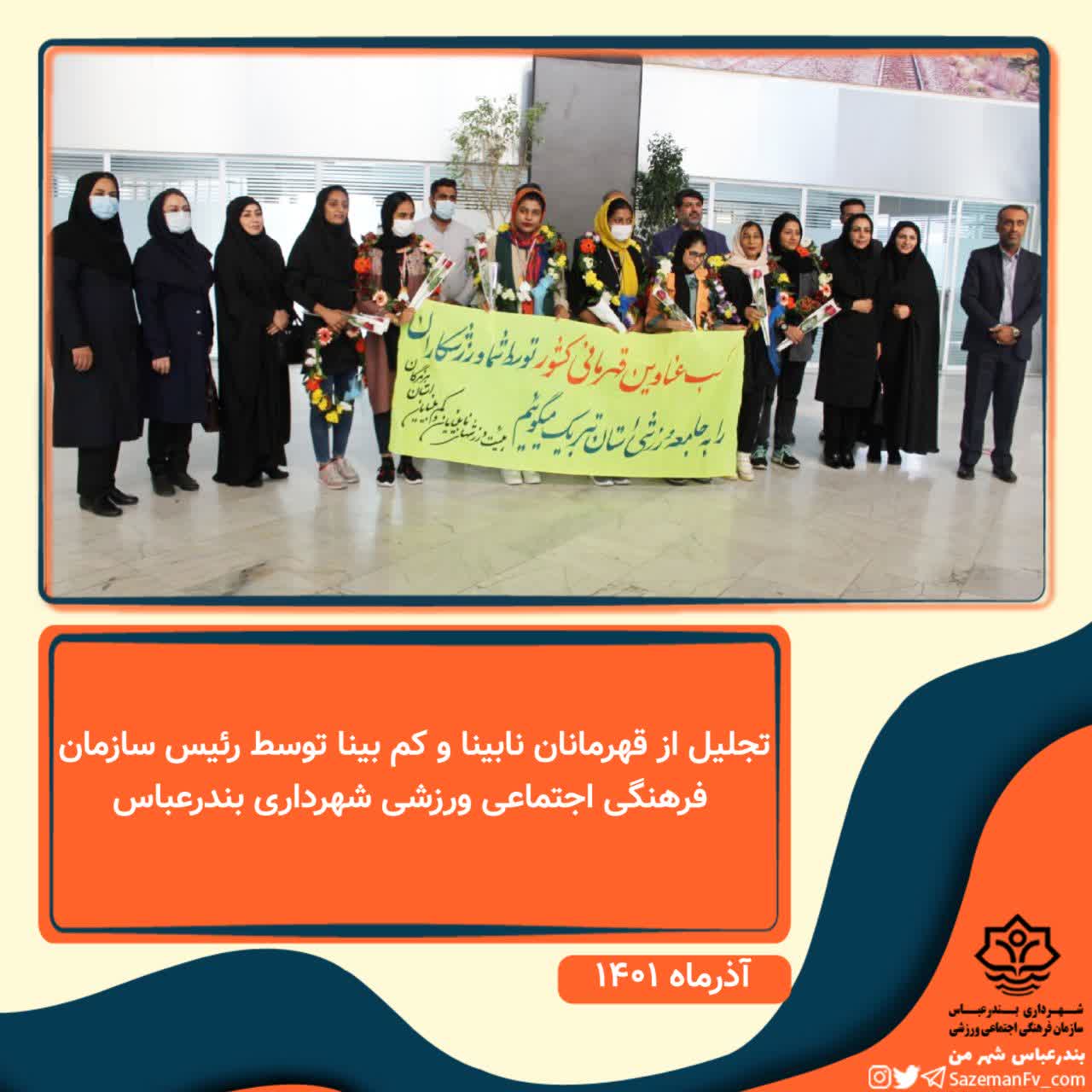 به گزارش مدیریت ارتباطات و امور بین الملل شهرداری بندرعباس به نقل از  روابط عمومی سازمان فرهنگی اجتماعی ورزشی شهرداری بندرعباس؛ در پی مدال آوری قهرمانان نابینا و کم بینا دختر در مسابقات کشوری ، رسول جهانداری رئیس سازمان فرهنگی اجتماعی ورزشی شهرداری بندرعباس به همراه معاون خدمات شهری شهرداری بندرعباس و تعدادی از مسئولین استان و شهرستان در مکان راه آهن با اهدای گل از این ورزشکاران تجلیل بعمل آوردند.