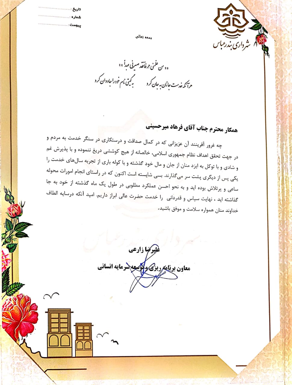 تقدیر از فرهاد میر حسینی پرسنل وظیفه شناس شهرداری بندرعباس