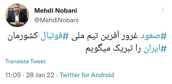 توييت مهدی نوبانی شهردار بندرعباس در پی پيروزی و صعود تيم ملی ايران به جام جهانی قطر