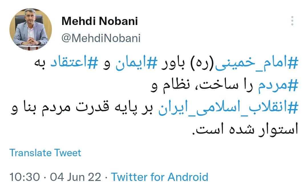 توييت شهردار بندرعباس به مناسبت ١٤ خرداد سالروز رحلت بنيانگذار جمهوری اسلامی حضرت امام خمینی (ره)
