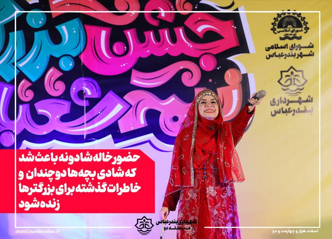 احمدی قلعه‌قاضی اظهار کرد: خاله شادونه و مجید ترکمان( کمدین عصر جدید) از جمله هنرمندان مطرحی بودند که با حضورشان شادی بچه‌ها را دوچندان و خاطرات گذشته را برای بزرگترها زنده نمودند. همچنین میثم مهنا (خواننده) از هنرمندان برتر استان هرمزگان و گروه موسیقی محلی نی انبان با هنرنمایی خود، این جشن را باشکوه‌تر کردند.