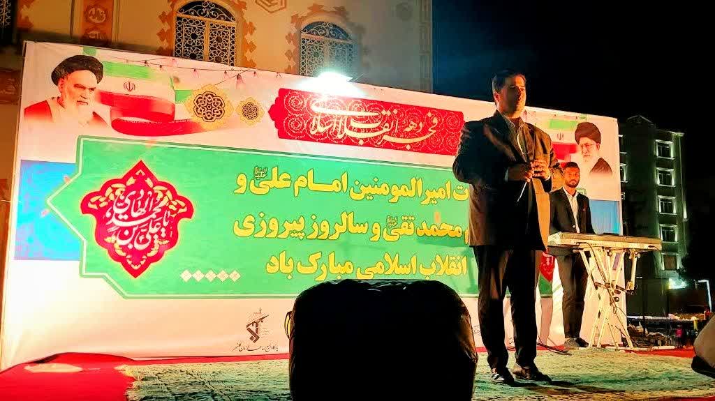 لازم به ذکر است در جشن برنامه هایی از جمله تلاوت قرآن وپخش سرود جمهوری اسلامی وسخنرانی خیرمقدم توسط امام جماعت مسجدامیرالمومنین(ع )محله ششصددستگاه حاج آقاعبادی انجام شد.