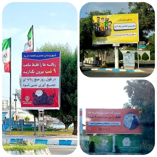 تابلوهای تبلیغاتی سطح شهر بندرعباس به یادآوری ساعت بیرون گذاشتن زباله ها به عنوان وظیفه مهم شهروندی، اختصاص داده شد.