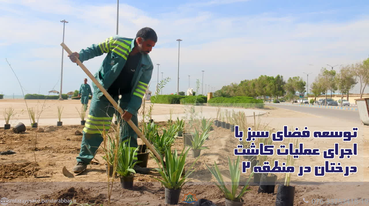 سازمان سیما منظر و فضای سبز شهری بندرعباس با هدف توسعه فضاهای سبز شهری و ارتقاء سرانه فضای سبز سطح منطقه ۲ اقدام به کاشت درختان از انواع متنوع در پارک ها و بلوارهای سطح منطقه نمود.