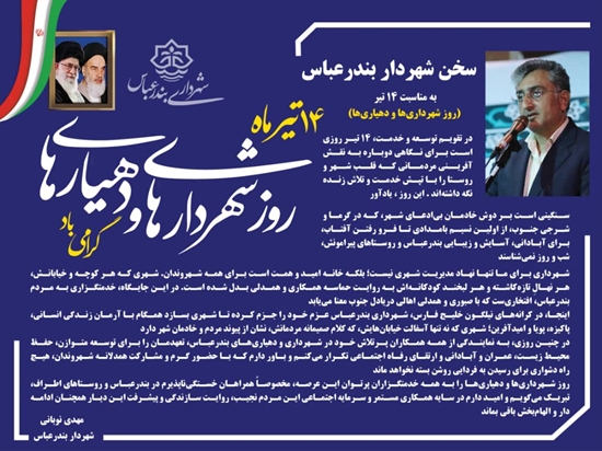 روز شهرداری‌ها و دهیاری‌ها را به همه خدمتگزاران پرتوان این عرصه، مخصوصاً همراهان خستگی‌ناپذیرم در بندرعباس و روستاهای اطراف، تبریک می‌گویم و امید دارم در سایه همکاری مستمر و سرمایه اجتماعی این مردم نجیب، روایت سازندگی و پیشرفت این دیار همچنان ادامه‌دار و الهام‌بخش باقی بماند.
