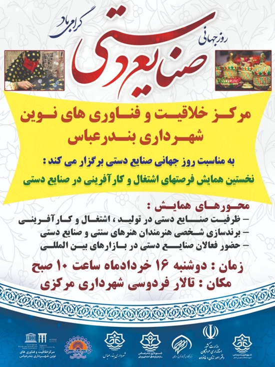 به گزارش مديريت ارتباطات و امور بين الملل شهرداری بندر عباس عاشوری مدير مرکز خلاقیت و فناوری های نوین شهرداری بندرعباس از برگزاری نخستین همایش فرصتهای اشتغال و کارآفرینی در صنایع دستی با حضور صنعتگران، اساتید و مسئولین این حوزه خبر داد