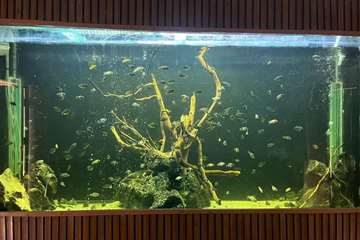 پروژه دیگری که مورد بازدید قرار گرفت پروژه آکواریوم بود. این پروژه قرار است در دو فاز مورد بهر برداری قرار گیرد. در فاز اول در اردیبهشت ماه سال جاری آکواریوم ها و قسمت درمانی دکتر فیش و فیش اسپا مورد بهره برداری قرار خواهد گرفت و در ادامه لنج، رستوران و تفریحات دریایی بهره برداری خواهند شد.