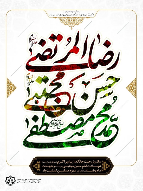 اینجانب سالروز رحلت پیامبر عظیم الشان اسلام، حضرت ختمی مرتبت، سید المرسلین محمد مصطفی (ص) و شهادت دومین نور ولایت، صاحب کرامت و شفیع قیامت حضرت امام حسن مجتبی (ع) و شهادت افتخار ایرانیان، حج الفقرا شاه خراسان حضرت امام رضا (ع) را به مردم شهر بندرعباس تسلیت عرض نموده، امید است توفیق پیروی از کلام حق و سیره اهل بیت (ع) را  در تمامی جنبه های زندگی داشته باشیم.