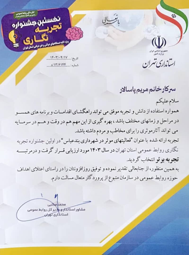 مریم پاسالار، مدیر ارتباطات و امور بین الملل شهرداری بندرعباس در نخستین جشنواره برترین های تجربه نگاری روابط عمومی ها در استان تهران حائز رتبه برتر شد.