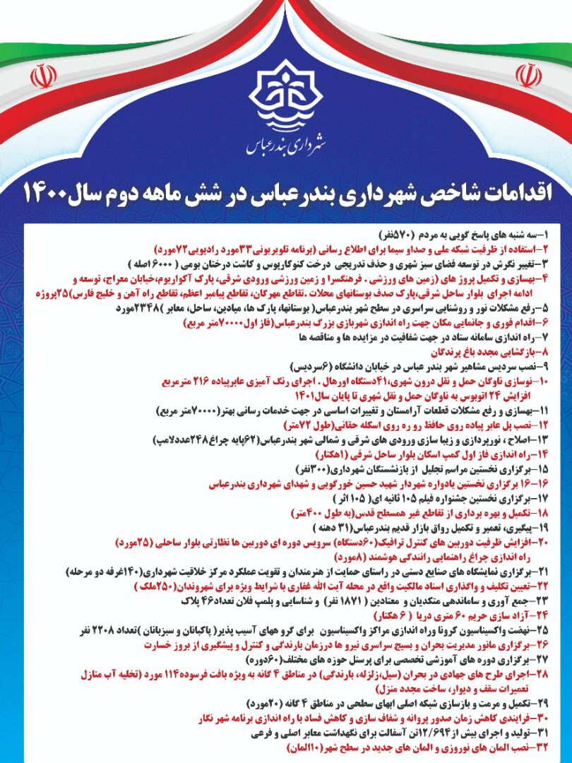شهردار بندرعباس گفت: راه اندازی سامانه ستاد جهت شفافیت در مناقصه و مزایده ها، راه اندازی اورژانس خدمات شهری در جهت کاهش زمان رفع مشکلات، بازگشایی مجدد باغ پرندگان، نصب المان های شهری جدید، نصب سردیس مشاهیرشهر، ساماندهی خودروهای حامل میوه و جانمایی محل شهربازی بزرگ بندرعباس و اقدامات اولیه جهت احداث بخشی از اقدامات انجام شده در ۶ ماهه دوم سال گذشته است.